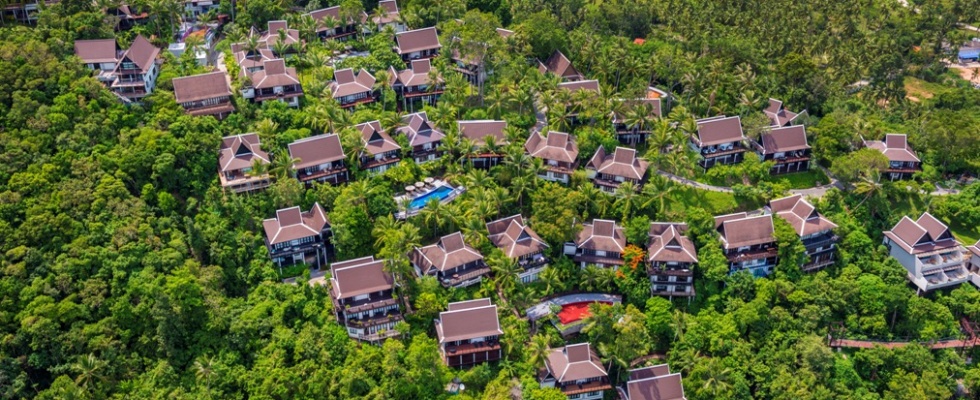 Тропічний павільйон (70 кв. м): тераса, спальня з вітальнею, ванна кімната з душовою кабіною. На першому поверсі вілли на пагорбі.
