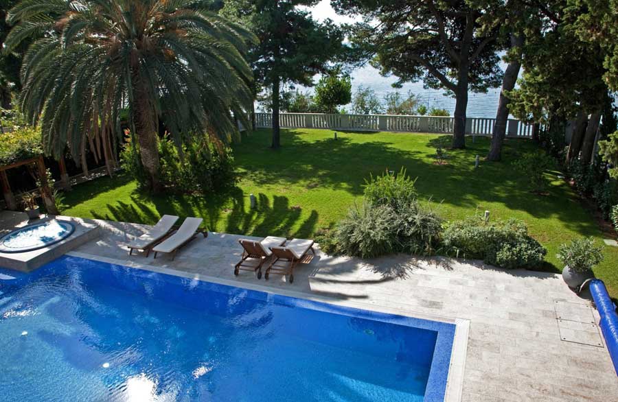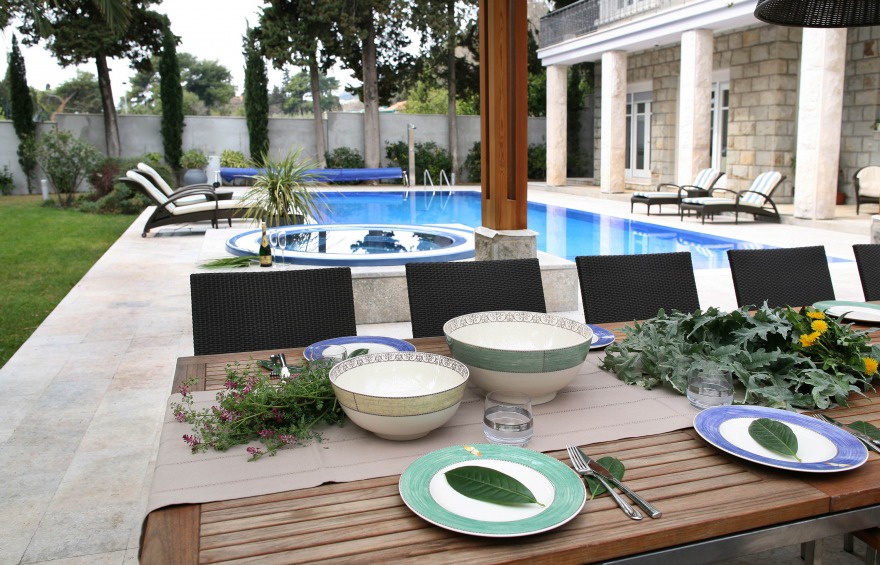Особливу увагу чудової вілли Castello Split привертає її розкішне оточення з дбайливо влаштованим садом, що простягається на площі 1000 м2, просторими терасами з меблевими гарнітурами для відпочинку, з двома великими пальмами та достатком середземноморської рослинності, що перетворює цю поверхню на ідеальне місце для спілкування, приготування різних страв з грилю, насолоди коктейлями з друзями, організації урочистих вечерь або обідів у дружній обстановці.
