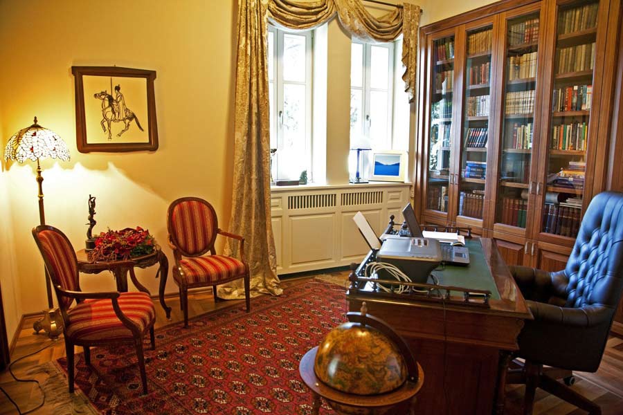 На другому поверсі, який одночасно призначений для денного дружнього спілкування, відпочинку та рекреації, знаходиться ще одна сучасно обладнана простора кухня, яка оснащена найкращими якісними апаратами, в якій можете насолодитися приготуванням різних страв. Тут своє ідеальне місце знайшов вестибюль з каміном, простора вітальня, прикрашена безліччю художніх картин, шкіряними меблями, дизайновим столиком та LCD SAT TV, яка відчиненими дверима пов'язані з об'ємною обідньою зоною. Столова частина обладнана високоякісними дерев'яними меблями та великим столом зі стільцями для трапези. З їдальні через великі двері шлях веде на терасу з гарнітуром для відпочинку та чудовим видом на оточення. Робочий кабінет, поєднаний із бібліотекою вілли, також розміщено на другому поверсі. Тут ви зможете насолодитися спокоєм цієї унікальної вілли та поринути у старовинні оповідання деяких книг, що пропонуються для читання.