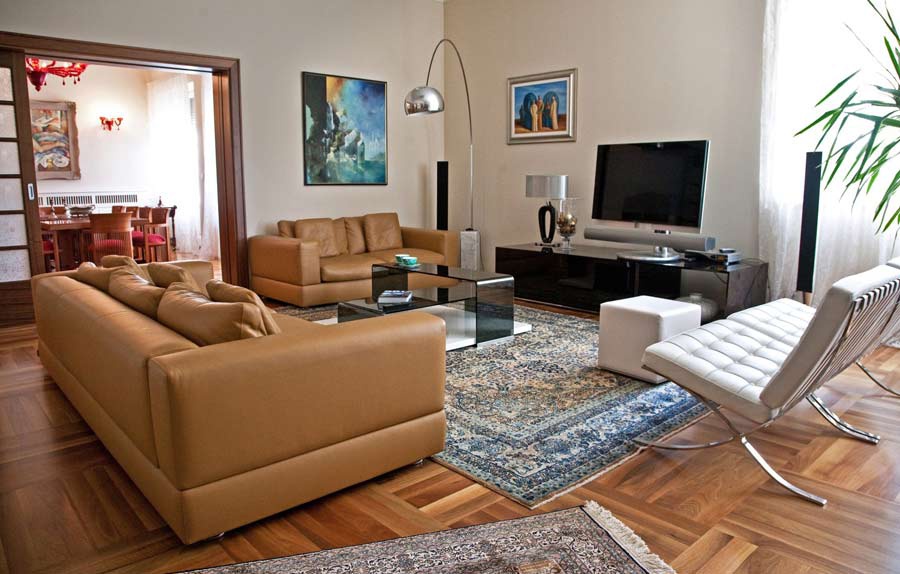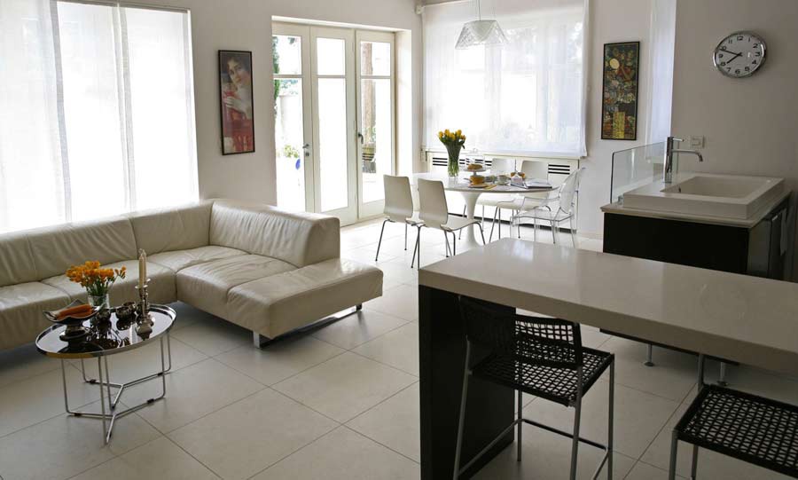 На першому поверсі прекрасної вілли Castello Split, в залитому сонцем та прозорому приміщенні розташована сучасна повністю обладнана кухня з барною стійкою та стільцями, обідня зона з ексклюзивним столом та стільцями, вітальня з великою шкіряною софою, дизайновим столиком та LCD SAT TV. У цій частині вілли також є простора спальня з двоспальним ліжком і сучасна ванна кімната з душовою кабіною. Цей поверх може представляти окремий апартамент вілли, а з верхнім поверхом з'єднується внутрішніми сходами.