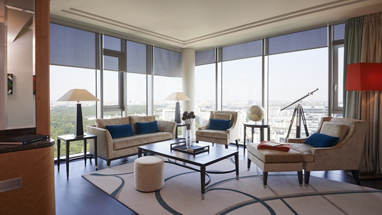 Посол Люкс: - 127 кв.м1 часй Номер з панорамними вікнами і захоплюючим панорамним видом на Берлін знаходиться на 31 поверсі. Складається з спальні з двоспальним ліжком або двома ліжками з близнюковою зоною дзвіночка, 6-особистою вітальнею з зоною, оснащеною міні-кухні, мармуровою ванною кімнатою, душовою кабіною і підігрівом підлоги.