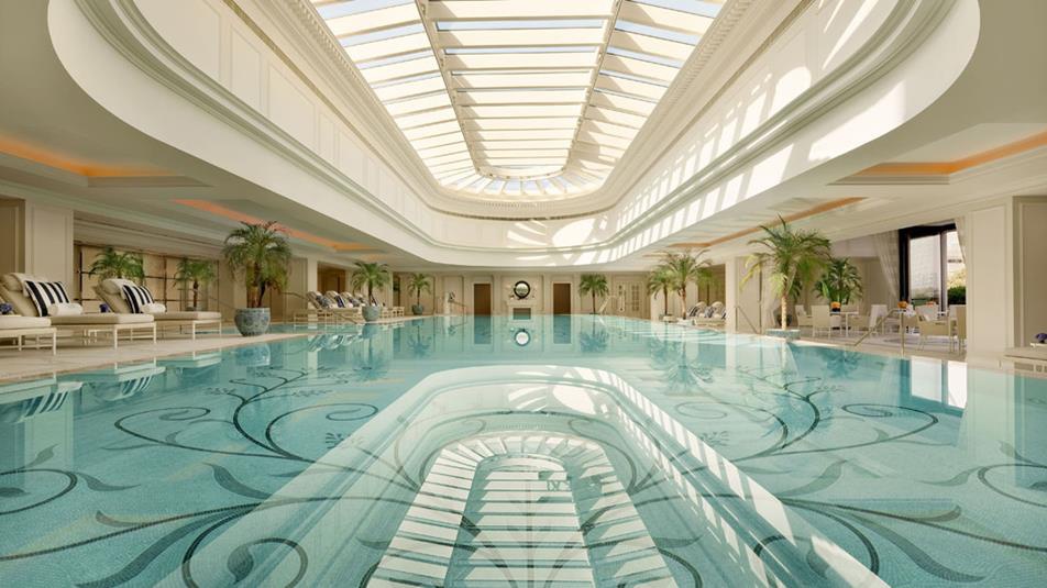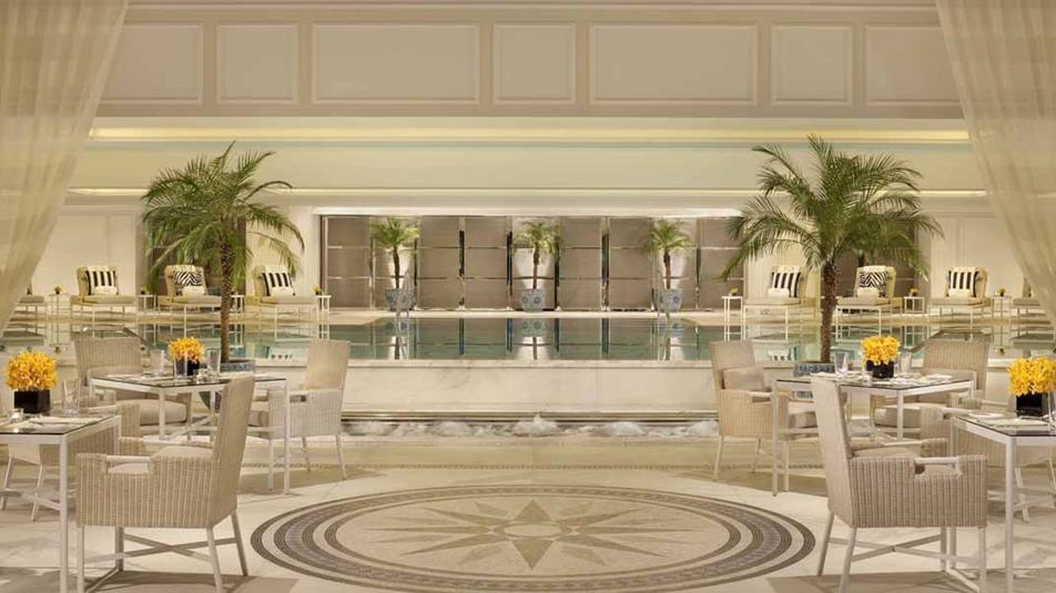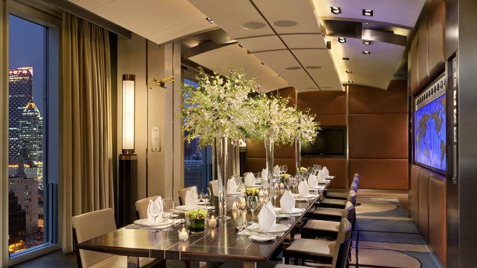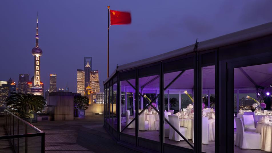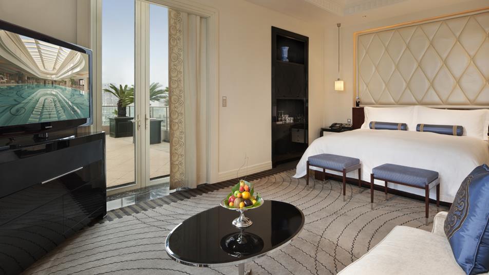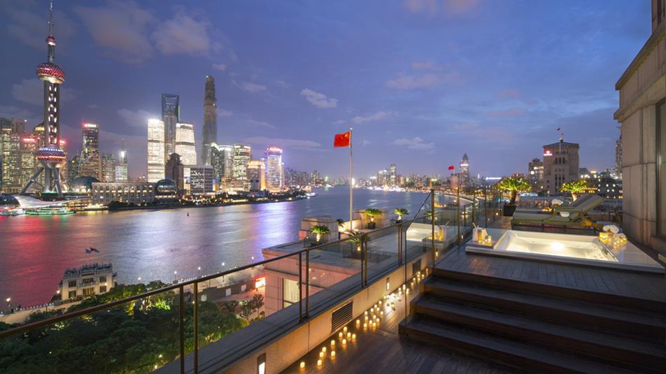 Астор люкс (116 кв. м): тераса (115 кв. м) з гідромасажною ванною, суміжна, їдальня, спальня з king-size ліжком, harbor, ванна кімната з ванною та окремою душовою кабіною, гостьова кімната. Площа басейну, річка та хмарочоси Пудун.