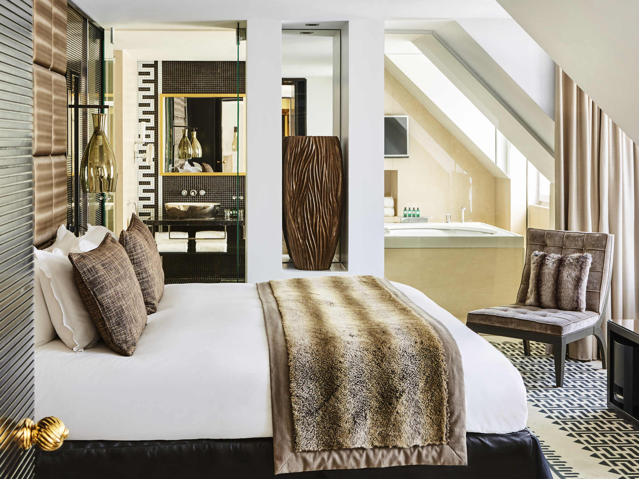 100 кв. м. Шикарні просторі апартаменти з видом на престижний паризький квартал складаються з великої спальні з ліжком розміру king-size та гардеробної, вітальні з диваном-ліжком, кабінету, ванної кімнати з джакузі, окремою душовою та хаммамом, окремого туалету. Розміщення: 5 осіб.