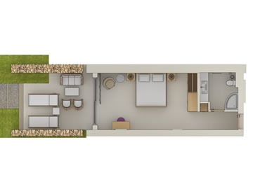 50 кв. Балкон, вітальня з обідньою зоною (4 персони), спальня, ванна кімната з ванною та душовою кабіною з функцією «тропічний дощ», приватний садок. Вид на сад.