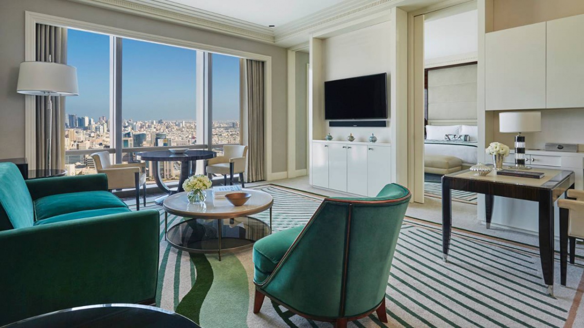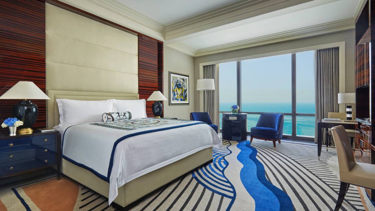 Прем'єра Номер: 55 кв.м. Номер складається з спальні з двоспальним ліжком king-size, мармуровою ванною кімнатою з ванною і душем, робочою зоною. Перська затока вид. Максимальне розміщення: 2 дорослих або 2 дорослих і 1 дитина.