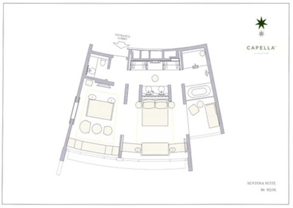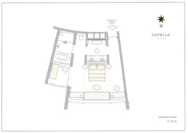 У готелі 112 різних категорій, включаючи Deluxe Room, Premier Room, Contellation Room, Sentosa Suite, Capella Suite, Villa та Colonial Manor. Номер інтернів поєднує в собі витончений аристократизм колоніального стилю і елегантний сучасний дизайн. Костюми і вілли виготовляються з оригінальним і вишуканим смаком в сучасному азіатському стилі на знаменитому дизайнерському проекті Джея Ібрахіма. З балкона і тераси номерів, є великі види паління тропічних лісів і садів, а також заспокійливих морів. Гості можуть скористатися індивідуальним помічником.