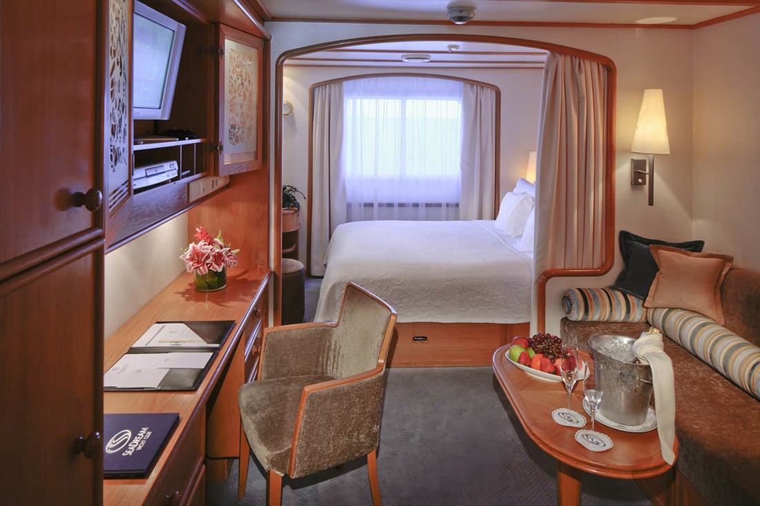 У салоні: два ліжка, що з'єднуються в одне ліжко, вітальня, телевізор, CD/DVD, MP3, душ з гідромасажем, сейф, міні-бар, фен.