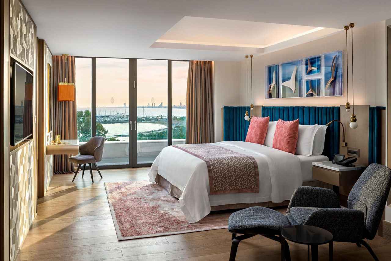 82 м. Бізнес-люкс з видом на море унікально оформлений для розміщення до двох гостей. Два з’єднані між собою балкони та елегантні мінімалістичні інтер’єри відображають кольори та геометричний візерунок острова в люксі. У просторій спальні встановлено фірмове ліжко King-size The Luxury Collection і витончена окрема ванна кімната відкритого планування з тропічним душем. Зона вітальні може похвалитися величним робочим столом, диваном і стільцями. Оснащений ультрасучасними технологіями, починаючи від безключового доступу, Smart TV, акустичної системи JBL і використання Samsung Flip, за запитом.