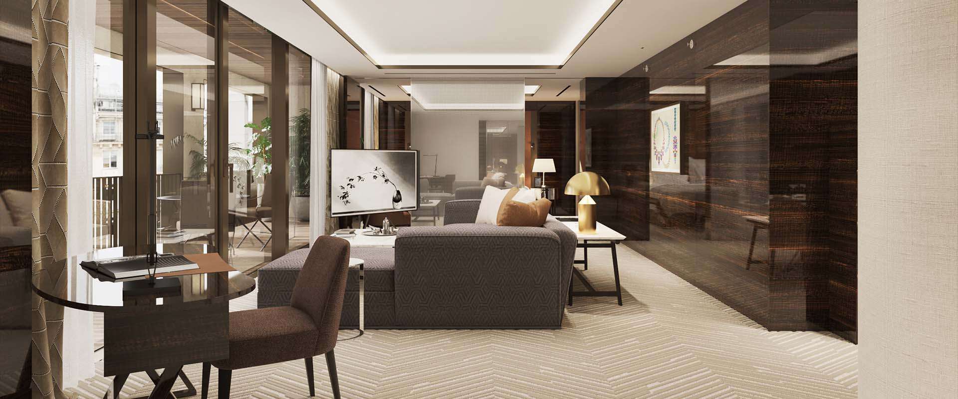 Люкс площею 141 кв.м має ліжко кінг-сайз, хаммам, гардеробну, вітальню, кухню та їдальню. З вікон відкривається краєвид на Ейфелеву вежу.