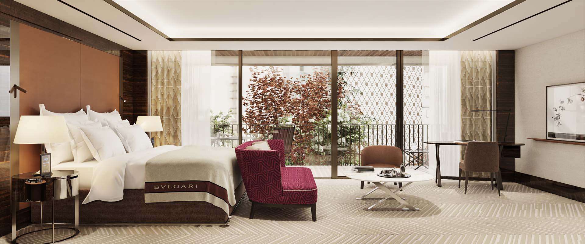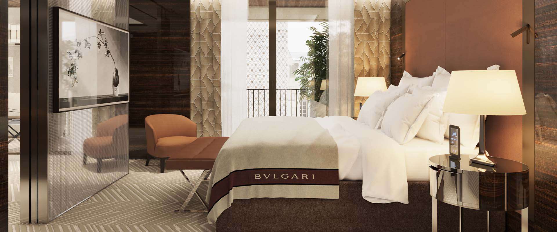 Як і всі готелі та курорти Bvlgari, Bvlgari Hotel Paris спроектований італійською архітектурною студією Antonio Citterio Patricia Viel. У готелі є бар з видом на сад, lounge-зона з плюшевими кріслами, масивним каміном і стелею, інспірованим клатчем-мінодьєром Bvlgari, дворівневий спа-центр площею 1300 квадратних метрів з 25-метровим басейном, фітнес-зал з приватною студією Gymnasium, розробленими для Bvlgari спортсменкою та моделлю Лі Маллінз.