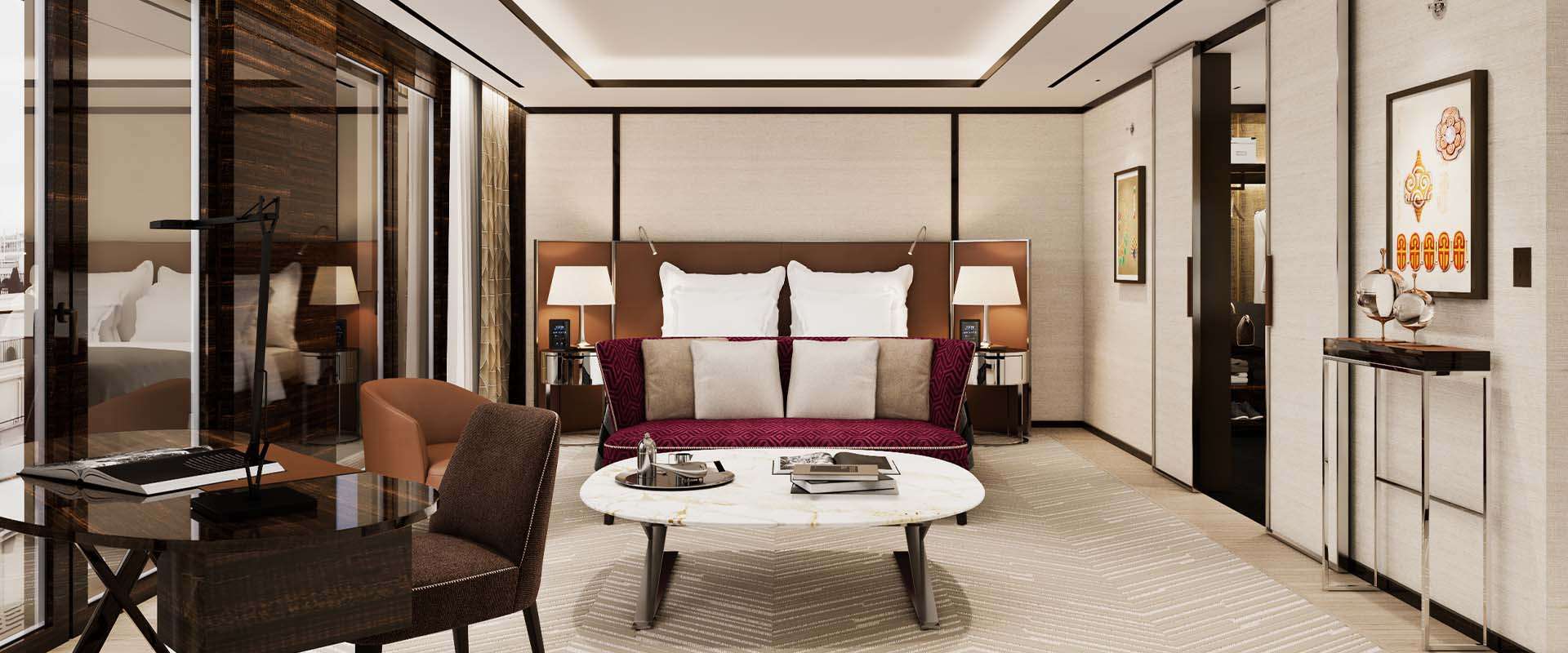 Люкс площею 123 кв.м має ліжко кінг-сайз, хаммам, гардеробну та вітальню. З вікон відкривається краєвид на Ейфелеву вежу.