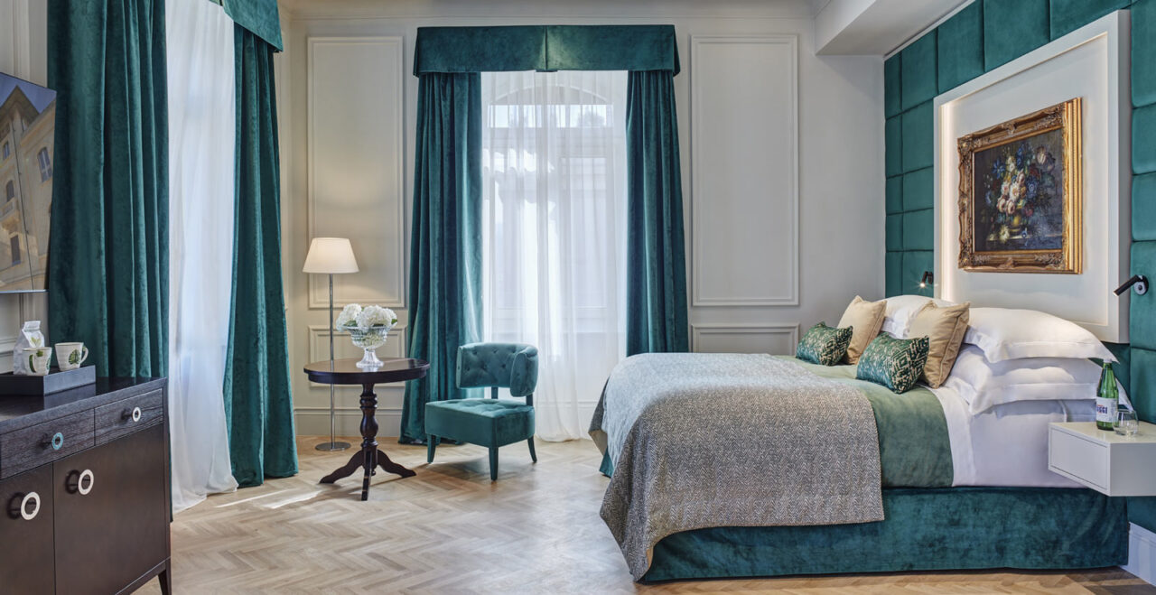 Курорт пропонує широкий вибір розміщення залежно від переваг гостей – від стандартних номерів до королівських люксів з окремою панорамною терасою площею 140 кв.м. Кожен номер виконаний в елегантному сучасному стилі, що гармоніює з історичною будівлею епохи ліберті. З кожного номера, наповненого природним світлом, відкривається чудовий краєвид на парк, старе місто або басейн. Номери оформлені каррарським мармуром та оригінальним паркетом, обставлені вишуканими сучасними меблями та прикрашені незвичайними фресками та декоративними елементами, оснащені вікнами у стилі модерн та люстрами з муранського скла. Кожна деталь нагадує про славну епоху і надає готелю неповторного шарму.