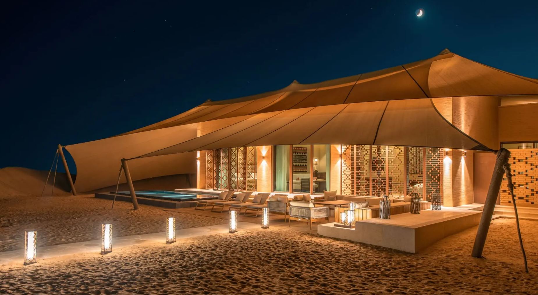 Відчуйте розкішне життя в цій оазі, де кожна з елегантних вілл-наметів нашіптує історії про арабську розкіш. Справжні предмети антикваріату ручної роботи прикрашають кожен куточок, високі стелі височіють над головою, а намети з балдахіном віддають шану землі, органічно зливаючись із пустельним пейзажем.