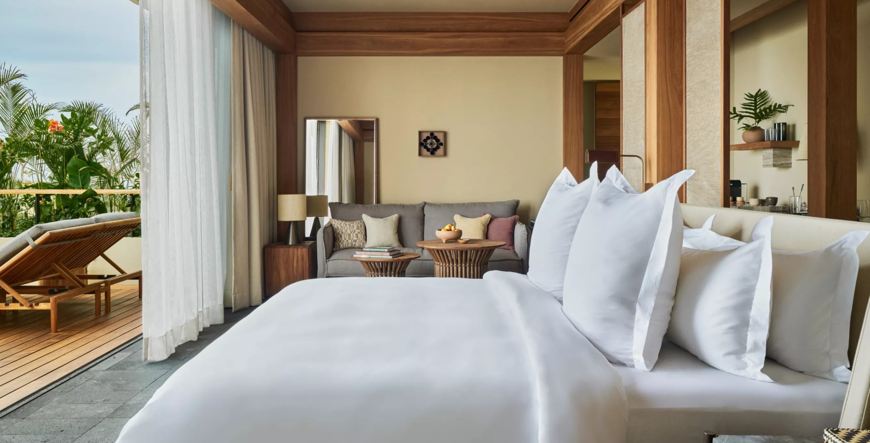 Чи то в огортаючих блакить Тихого океану, чи в сімейних та дорослих басейнах, вода лежить в основі магнетизму Rosewood Mandarina. Поніжтеся на сонці Рив’єри біля басейну, розслабтеся в затінених кабінках або дослідіть унікальну красу незайманого узбережжя Наяріта.
