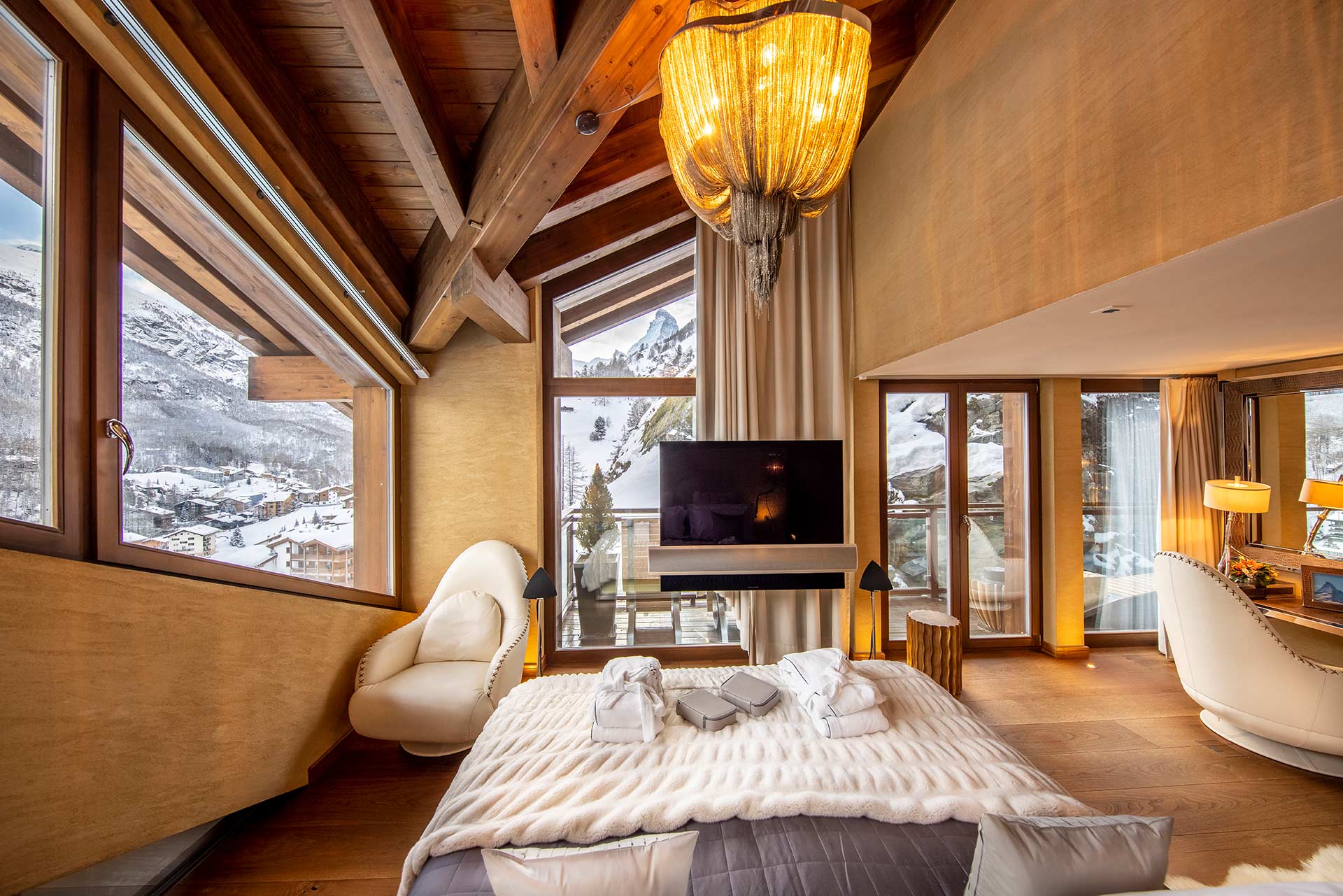 Шале розташоване цілком у центрі Церматта, але досить відокремлено, щоб відчувати тишу і види гір. Вид на Маттерхорн та навколишні піки відкривається практично з усіх вікон. Його позиція дозволяє насолоджуватися всіма принадами курорту, зберігаючи приватність.