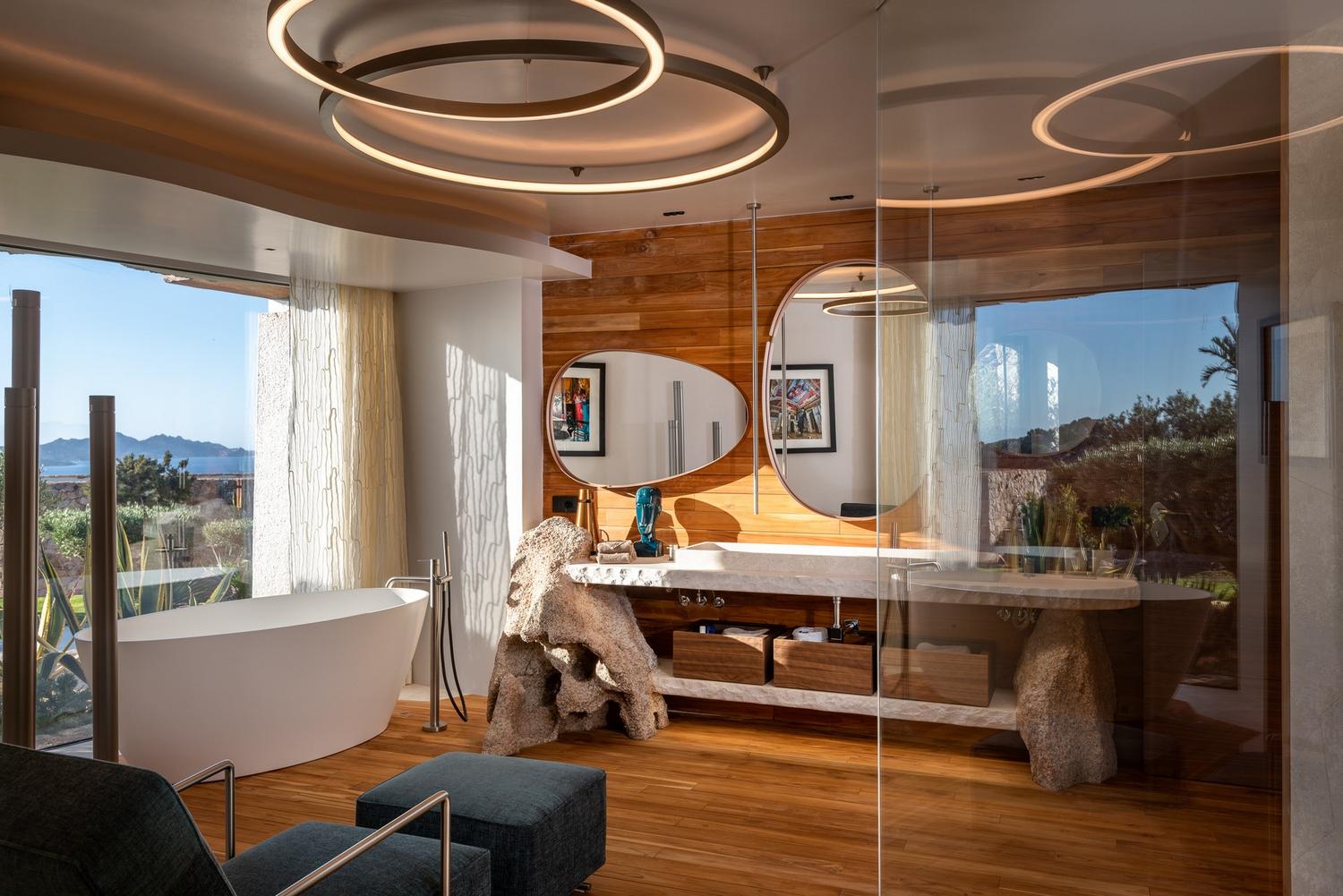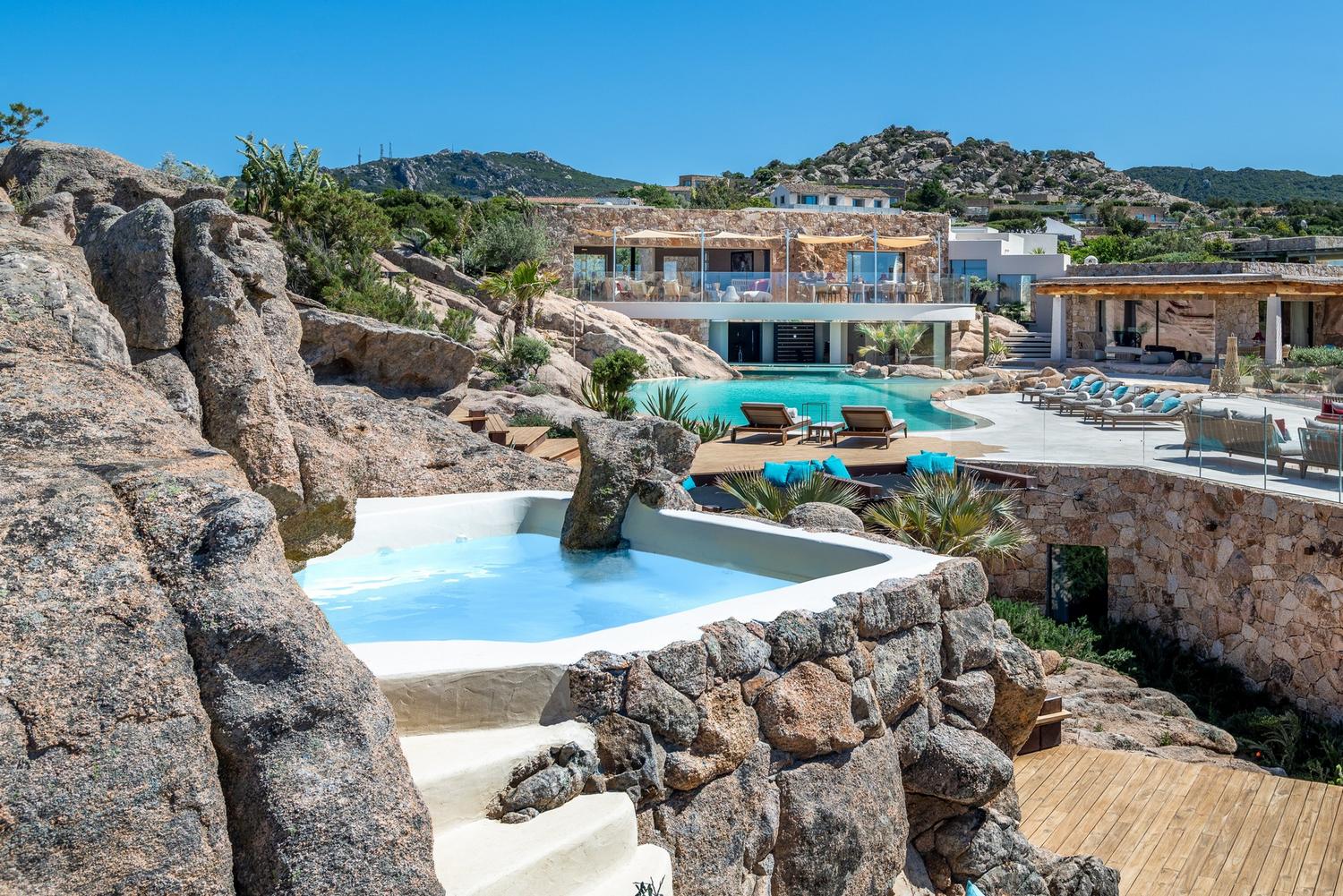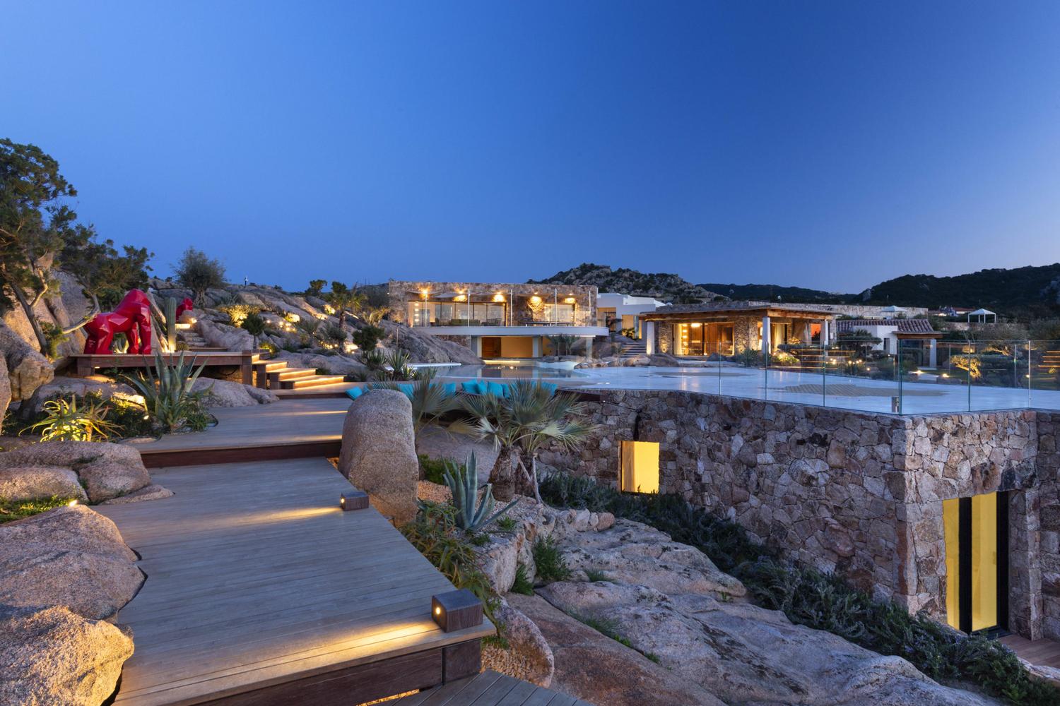 Вілла гармонійно вписується в захоплюючий дух ландшафт Сардинії з гранітними скелями, оливковими гаями та середземноморською зеленню, що пропонує унікальний баланс усамітнення, розкоші та панорамного виду на море.