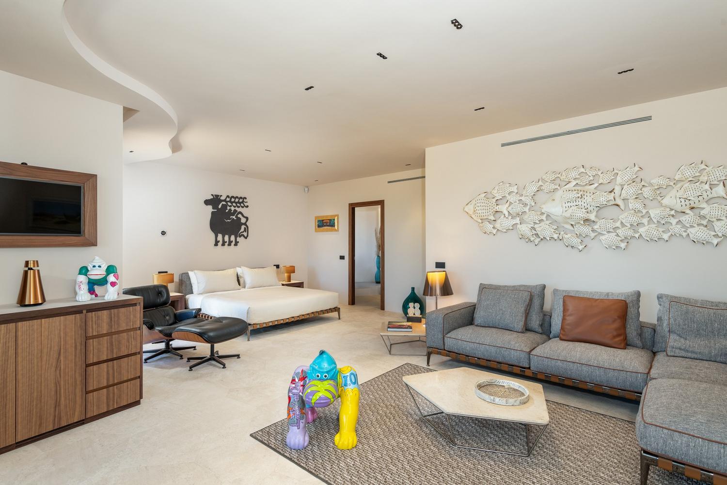 Головна спальня (майстер-сьют) з king-size ліжком, власною ванною та приватною терасою з видом на море.