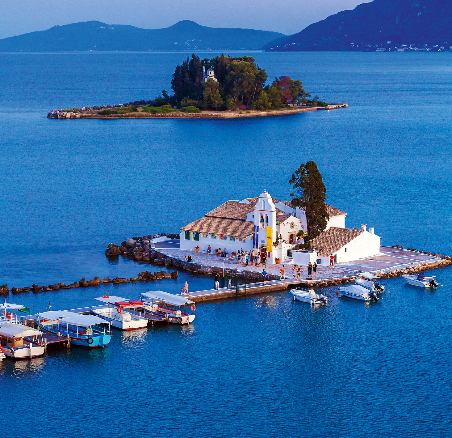 На крихітному острівці, з’єднаному пірсом з Керкірою, знаходиться білосніжний монастир Влахерна з капличкою Діви Марії 17 століття, де зберігається чудотворна ікона Божої Матері. Поряд, у декількох хвилинах на човні, вкритий деревами острів Понтіконісі з монастирем Пантократор 12–13 століть. Там малюють красиві ікони у візантійському стилі. Обидва монастиря є візитівками Корфу.