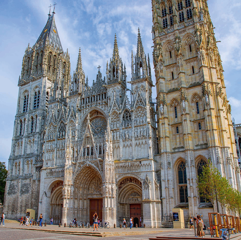Головне місто Нормандії, Руан є малою батьківщиною Гюстава Флобера. Тут і музей, і готель, й міст його імені. Туристичні маршрути міста та його околиць багато в чому пов’язані з “Мадам Боварі”. Вважається, що розкішний готель De Bourgtheroulde став прототипом готелю, де Емма зустрічалася з Леоном. Джерелом натхнення для письменника слугував Руанський собор. Й не лише для нього. Клод Моне присвятив храму цикл з 30 картин. Протягом двох років, у 1892 і 1893, він знімав студію навпроти собору і міг передавати різні ефекти освітлення за різної погоди й часу. Художник малював одразу декілька картин, намагаючись вловити гру світлотіні.